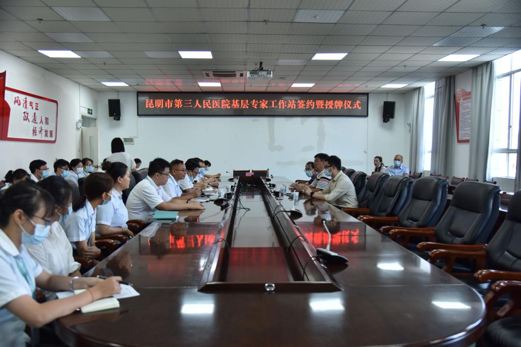 2022年7月15日,由昆明市第三人民医院杜映荣院长带队到365平台官方_365bet平台规则_365bet400电话人民医院建立李明武专家团队工作站并进行了签约授牌仪式,本次会议由365平台官方_365bet平台规则_365bet400电话人民医院副院长毛文华主持,县卫生健康局副局长张国虎出席会议。