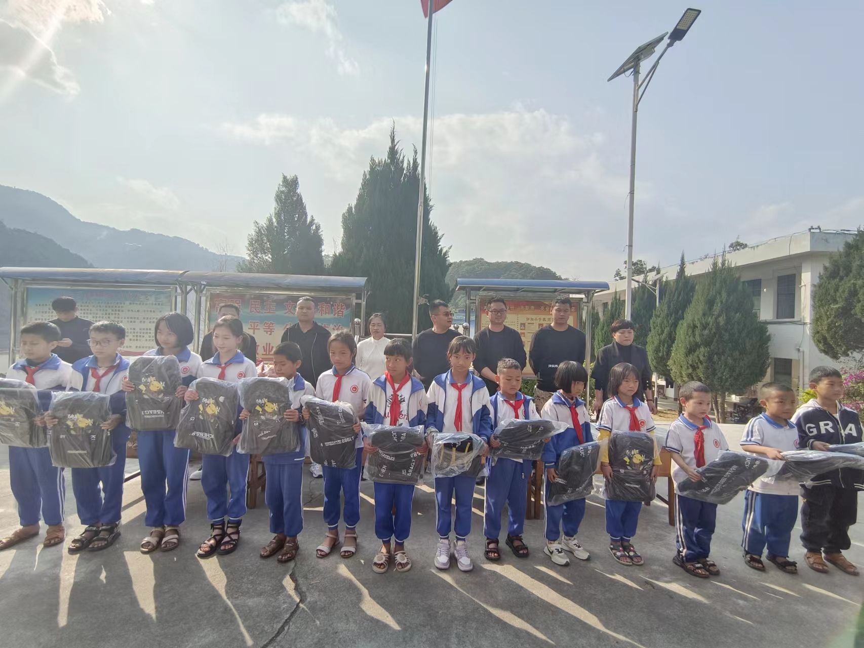 爱心物资包括篮球6个,羽毛球10副,大跳绳8根,笔记本200本,文件夹20个,书包125个,捐赠的体育用品和生活学习用品为学生的校园生活增添了乐趣,带去了温暖。